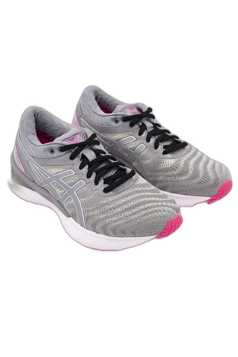 Silver, White, and Pink Lace-Up Running Shoes for Women with Gel Nimbus 22 Lite Show.