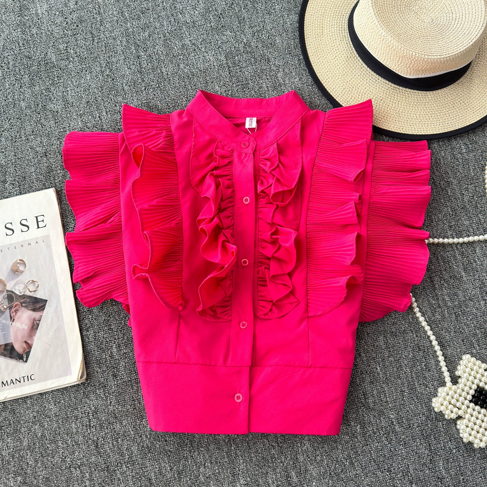 New 2024 Vietnamese trendy pleated ruffled sleeveless shirt Summer college