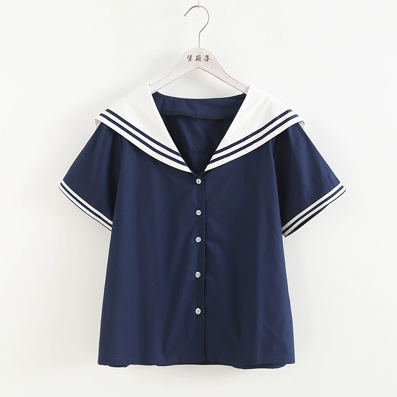 Cotton navy neck short sleeve single-breasted loose shirt