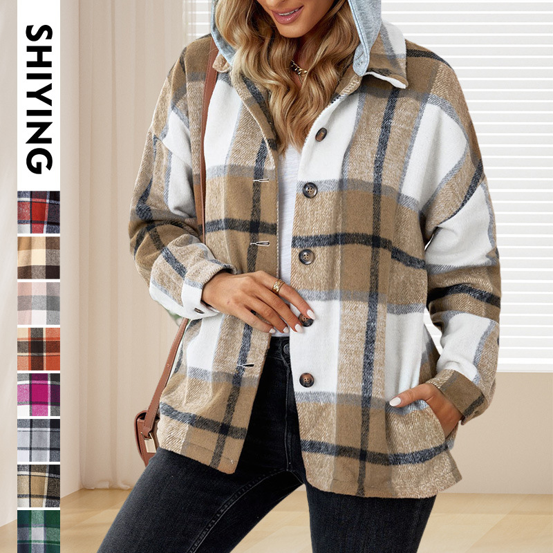 Shiying cross-border women’s autumn and winter plaid hooded jacket Europe and the United States new loose Joker shirt coat a generation of hair