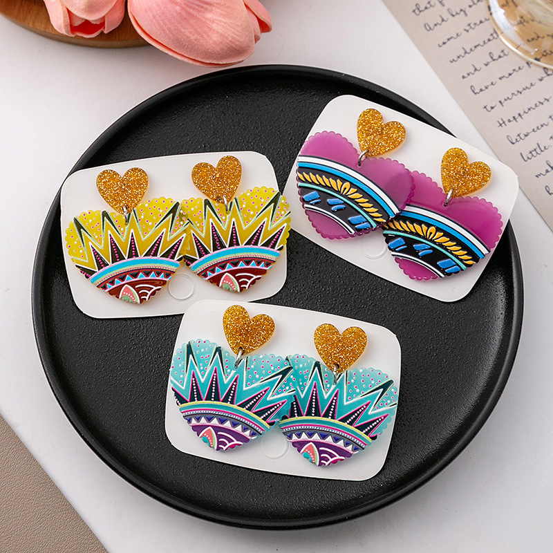 Silver Needle European and American cross-border love acrylic earrings vintage printed contrast color sequin earrings personalized painted earrings