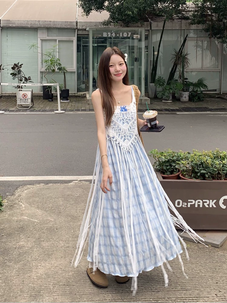 Sweet and spicy blue plaid fringed blouse two-piece set