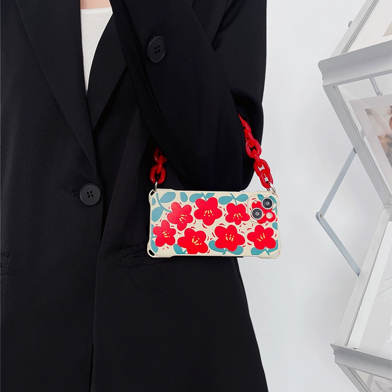 iPhone16 mobile phone case small red flower suitable for Apple 13promax mobile phone sleeve crossbody chain red 15pro silicone white all -inclusive xsmax