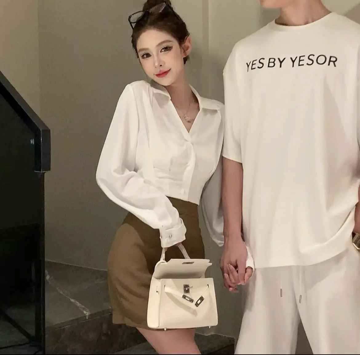 Secretary Kim wears a striped pleated slim long-sleeved shirt