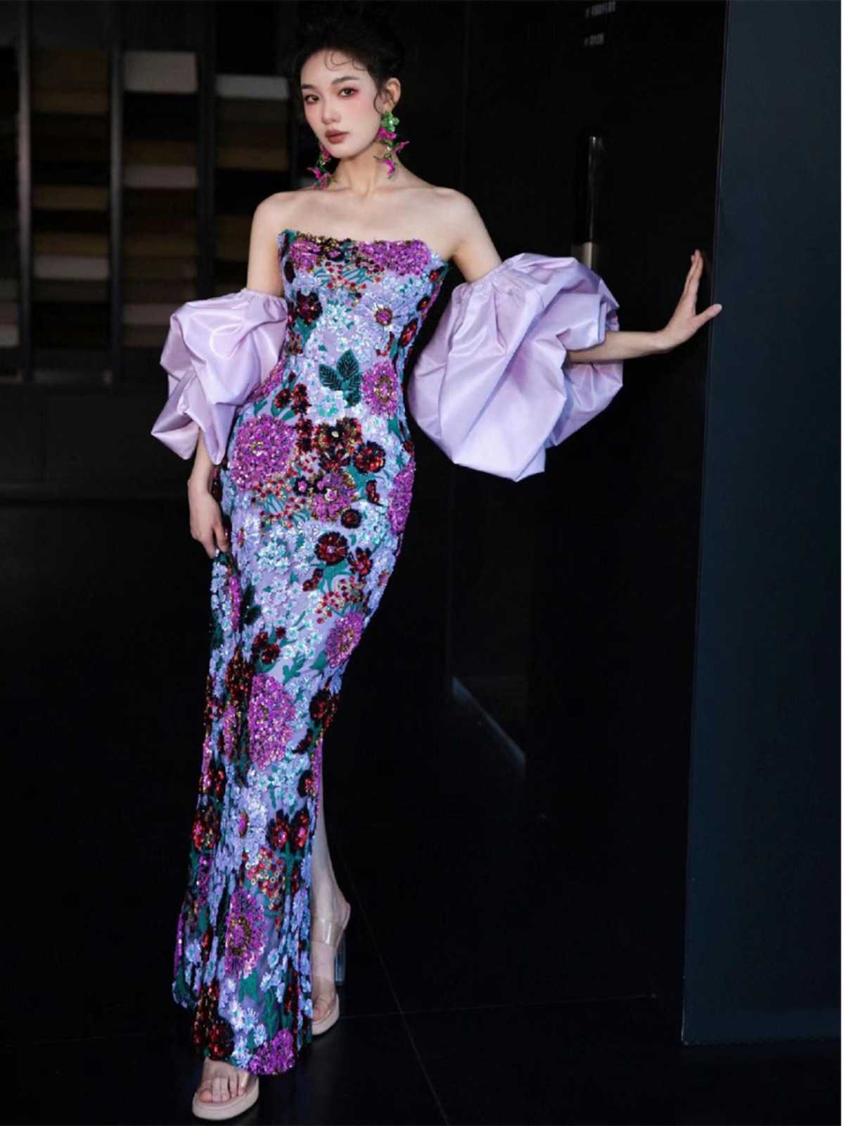 A two-wear purple flower bride wedding toast birthday party host wedding evening dress 19881