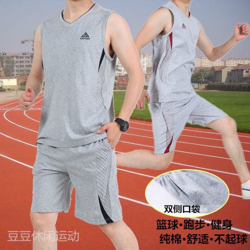 Sports suit Men’s Summer Running Fitness Clothes Sleeveless Vest Shorts Set of Cotton plus size Loose Basketball Clothes