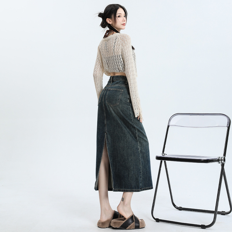 Vintage Cement Grey Denim Skirt Women’s Spring and Autumn Mid-length Hip Covering Slimming High Waist A- Line Split Hip Skirt