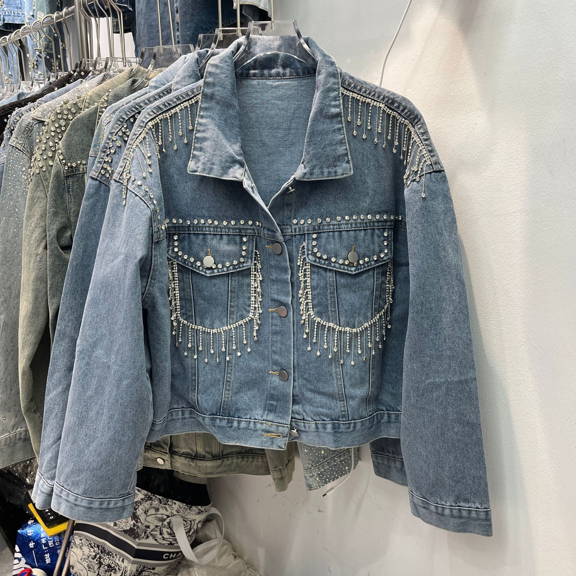 European Diamond Tassel Denim Jacket Women’s Fashion 2024 New Autumn Small Loose Slim Long Sleeve Top
