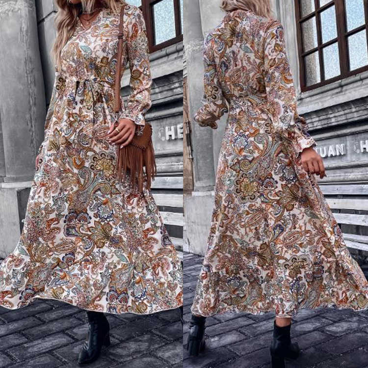 Cross-border foreign trade 2023 Amazon AliExpress autumn and winter floral dress printed stand collar ruffled long sleeve dress
