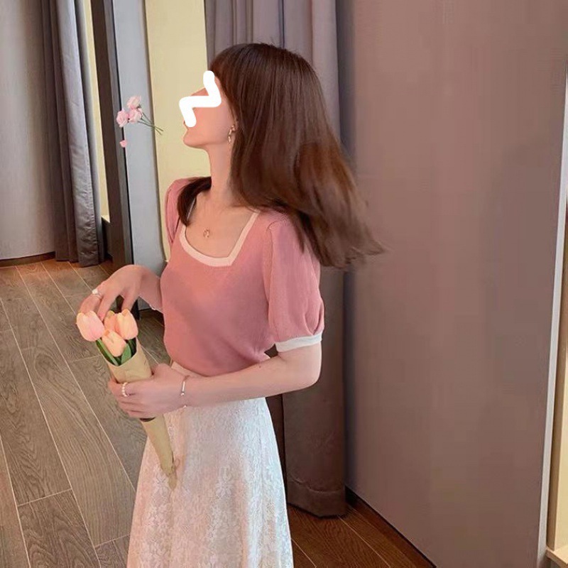 Summer 2024 New Square Neck French Puff Sleeve Top Women’s Pink Knitted Short-sleeved T-shirt Design Sense Niche