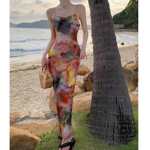 Retro oil painting slim Sanya temperament long skirt thin suspender