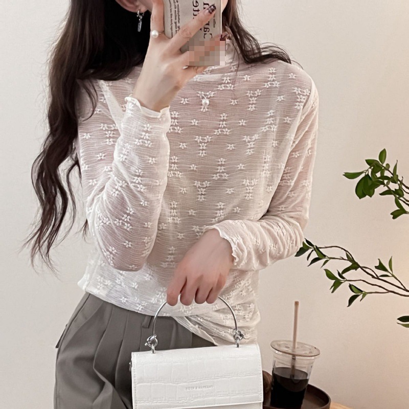 Base shirt women’s lace high collar wooden collar autumn long sleeve mesh pleated top factory wholesale AliExpress