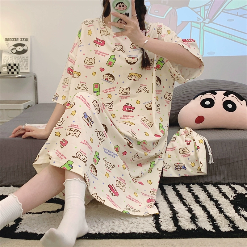 Breast -ending nightdress, women’s summer Korean simple short -sleeved shirt skirt can wear loose pajamas home clothes