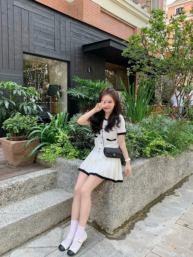 Sweet ice silk knitted cardigan short-sleeved top set skirt
