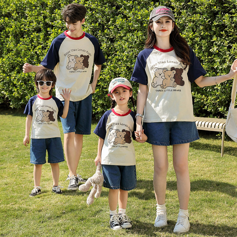 Cyber Celebrous Parent-child Cartoon T-shirt Family of Four Summer Dress New Style Western Style Mother and Son Mother and Dresses Fashionable Raglan Short Sleeve