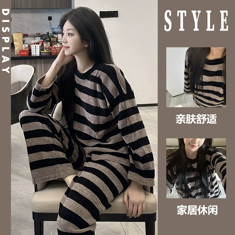Girls’ high-end plush knitted striped pajamas for women winter new style plus velvet and thickened warm home clothes large size suit