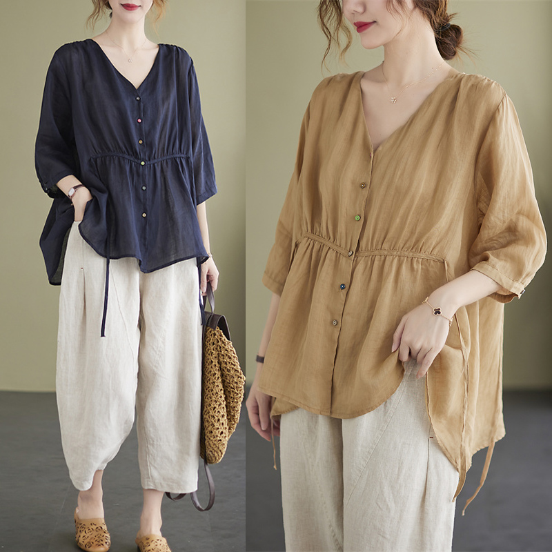 W2 plus size Women’s Middle-aged Mother Stylish High-end Two-piece Set Noble Cotton and Linen Fashion Casual Shirt Top Summer Set