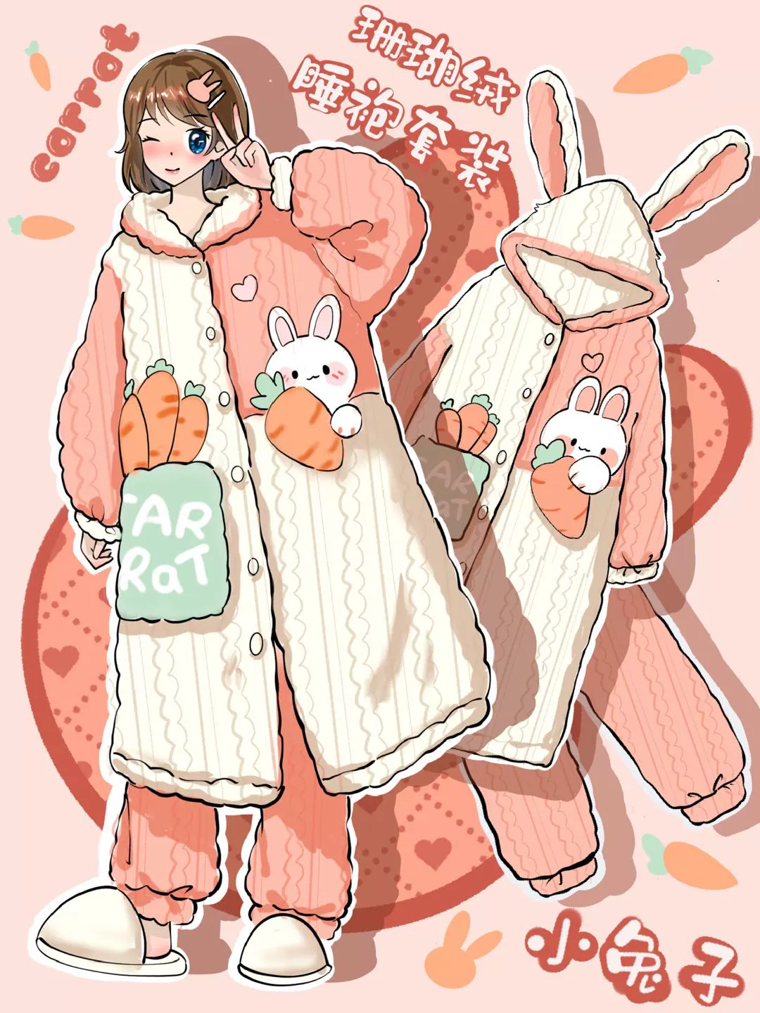 Carrot Rabbit! Winter cute pajamas for women plus velvet and thickened coral velvet nightgown for girls autumn and winter home wear set