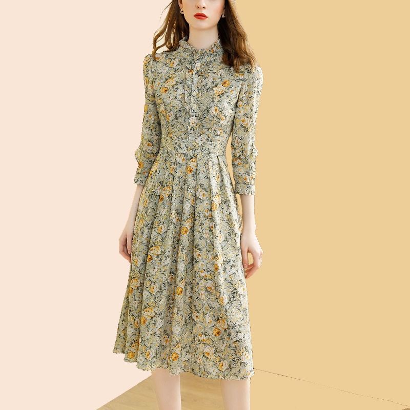 Women’s Spring and Summer Stand Collar Mulberry Silk Dress with Fungus Trim