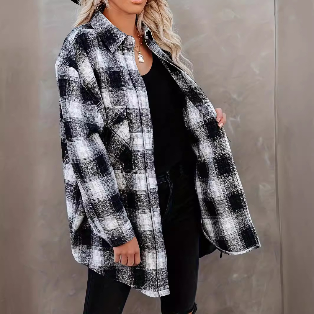 LN1006 in stock 2024 spring and summer new cross-border women’s fashion temperament printed long coat plaid shirt