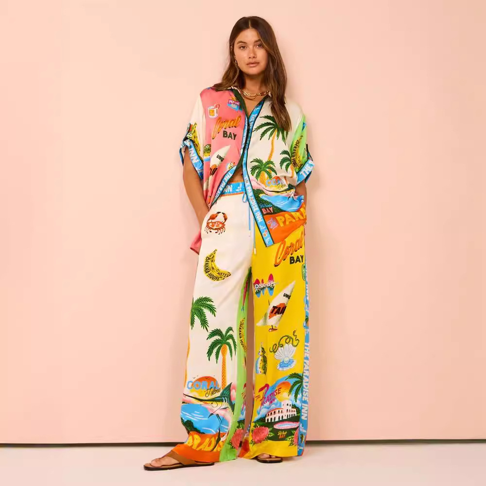 Europe and the United States cross-border 2024 independent station AliExpress fashion personality printed short sleeve color matching holiday leisure tether suit