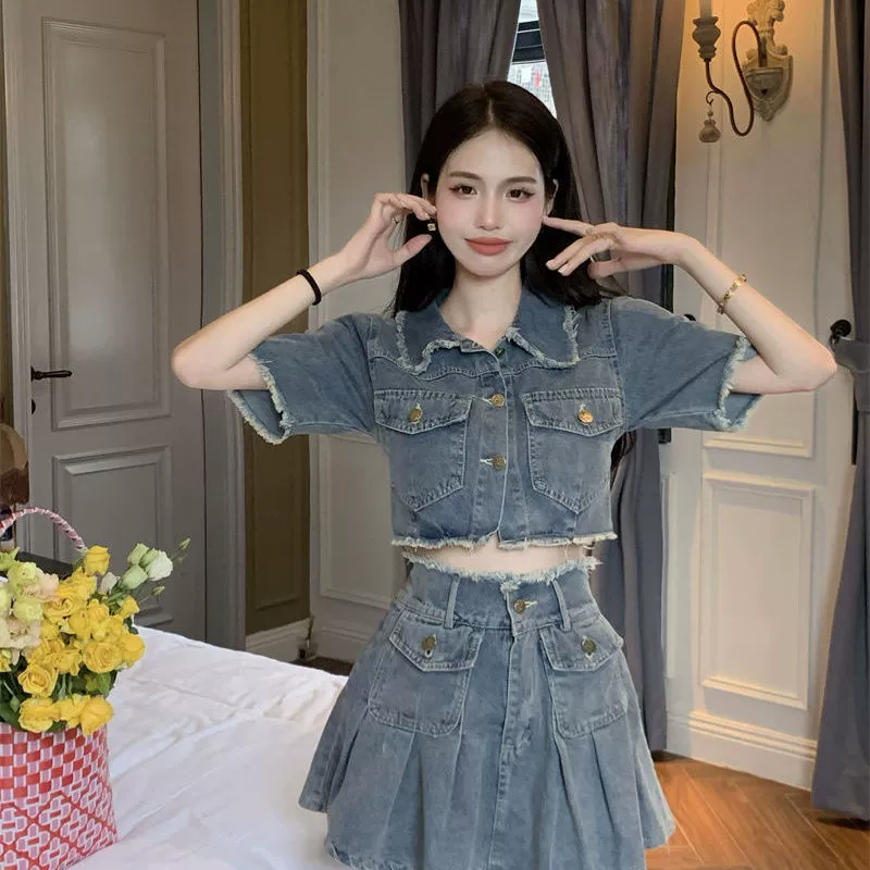 Women’s washed raw edge denim summer two-piece skirt