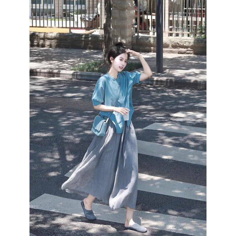 2024 Summer Zen Loose Casual Skirt Two-piece Set French Artistic Retro Shirt Short-sleeved Top for Women
