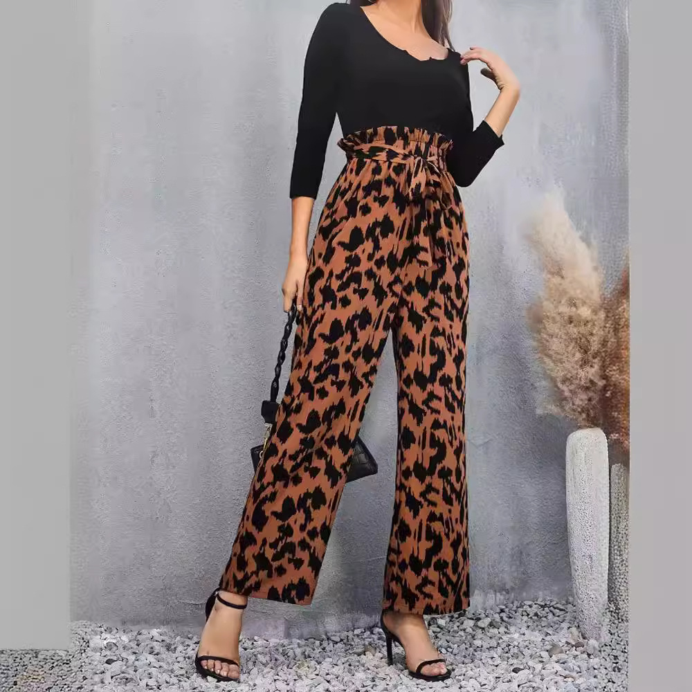 Cross-border 2024 spring women’s elastic waist needle woven printed jumpsuit women’s belt straight casual pants spring women’s