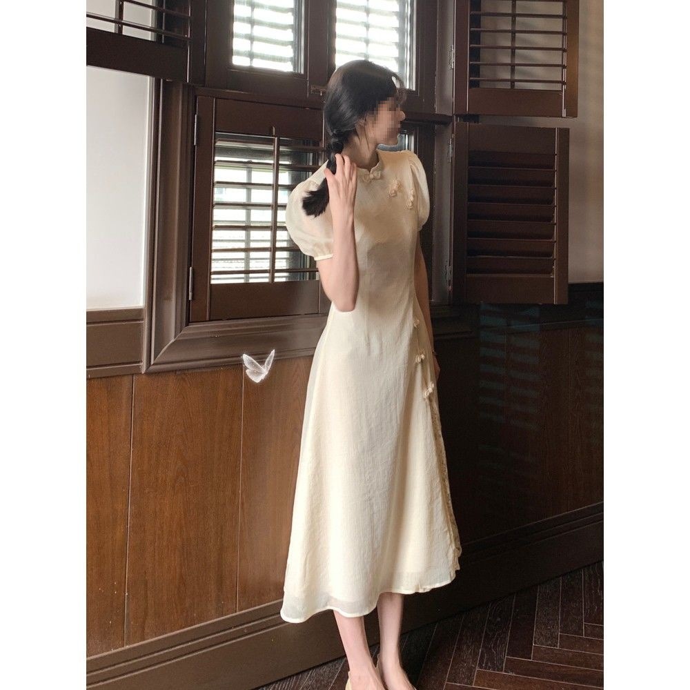 Chinese Style Improved dress Women’s 2022 Summer New Arrival Stitching Lace Puff Sleeve Tight Waist French Cheongsam