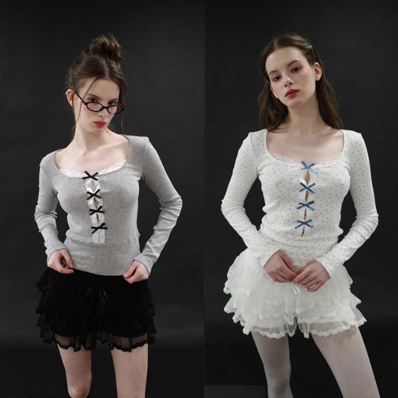 Spliced contrasting T-shirt slim long-sleeved top bow