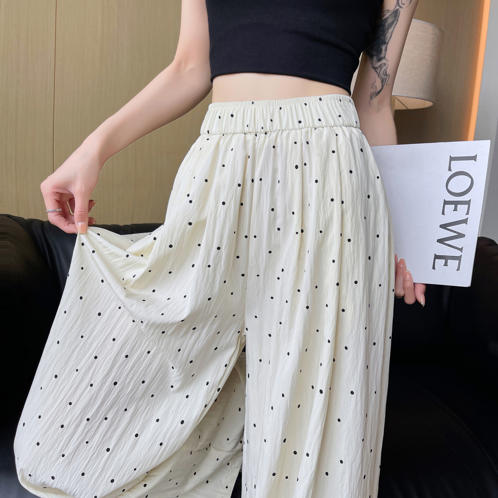 creamy-white Wave Dot Ice Silk Cotton and Linen Wide Leg Pants Women’s Summer Thin Pants High Waist Loose Dagging Casual Yamamoto Pants