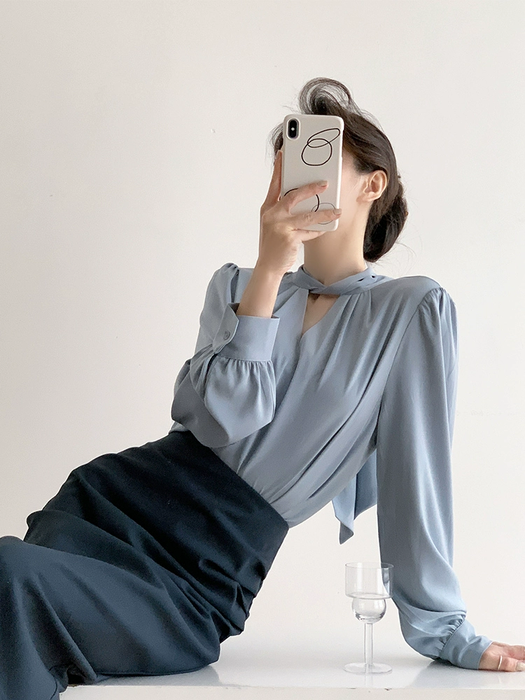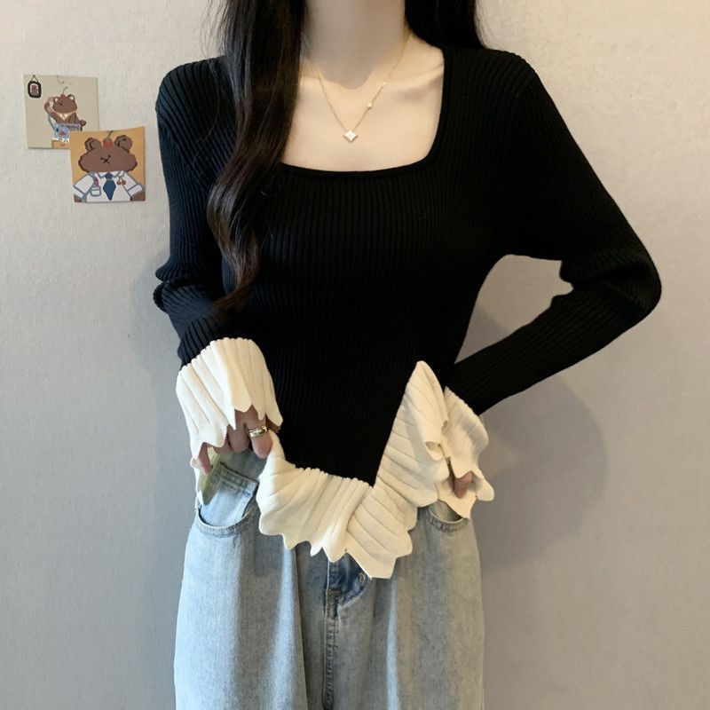 French Style Design Irregular Long-sleeved Sweater Women’s Autumn Slim-fit Slimming Square Collar Ruffled T-shirt Top