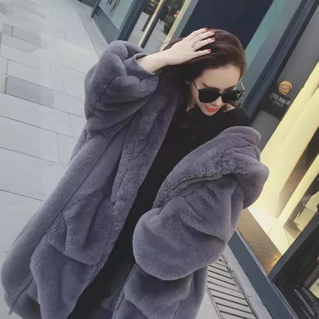 New Imitation Rex Rabbit Hair Thickened Long Loose Hooded Fur plus size Coat Maomao Women’s Coat Warm