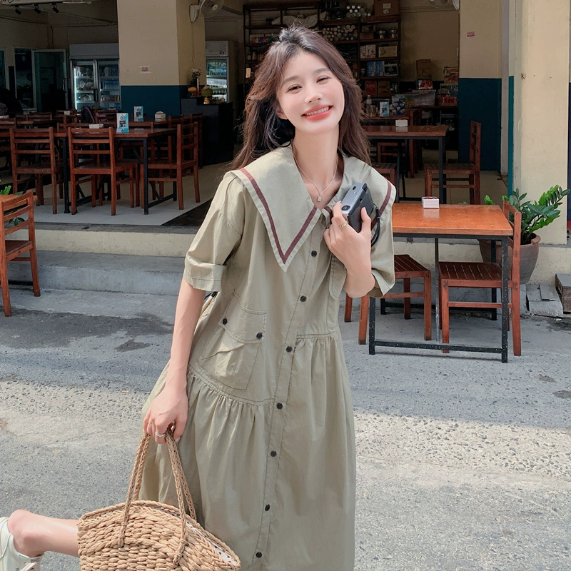 Sweet Salt Shirt Dress Summer Large Size Women’s Wear Belted Slimming College Style Badge Striped Skirt 62428