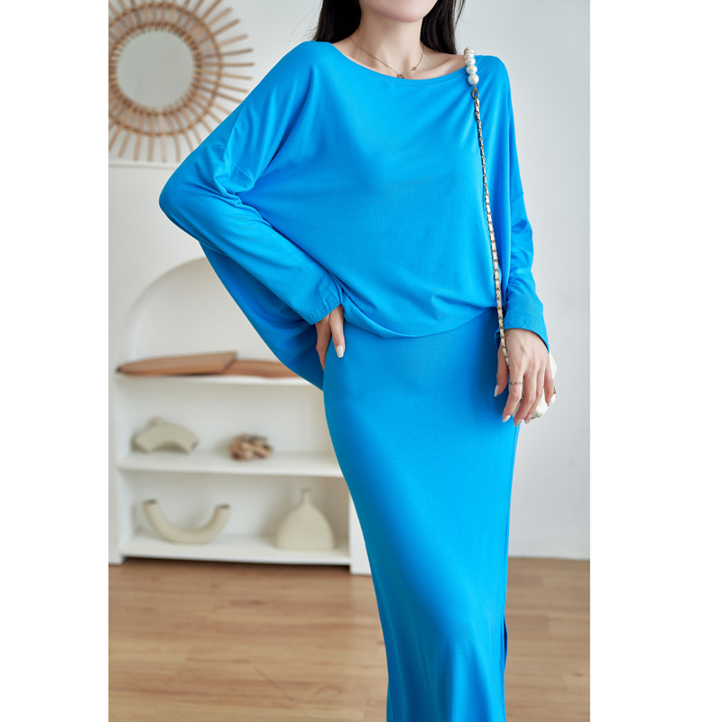 Korean Style Loose Flesh Covering Body-Slimming Dolman Sleeve T-shirt Bag Hip Split High Waist Skirt Slimming Dress Suit