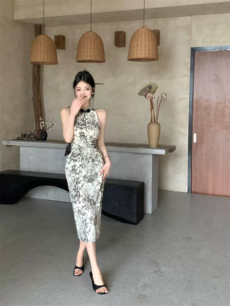 Pure spicy girl wind hanging neck camisole dress female Xia Fang collar pleated belt and net yarn design sense light luxury hip skirt
