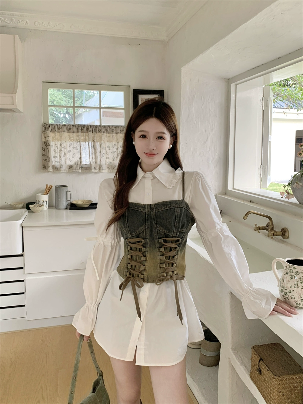 Sweet and spicy spring denim vest layered with white suspenders