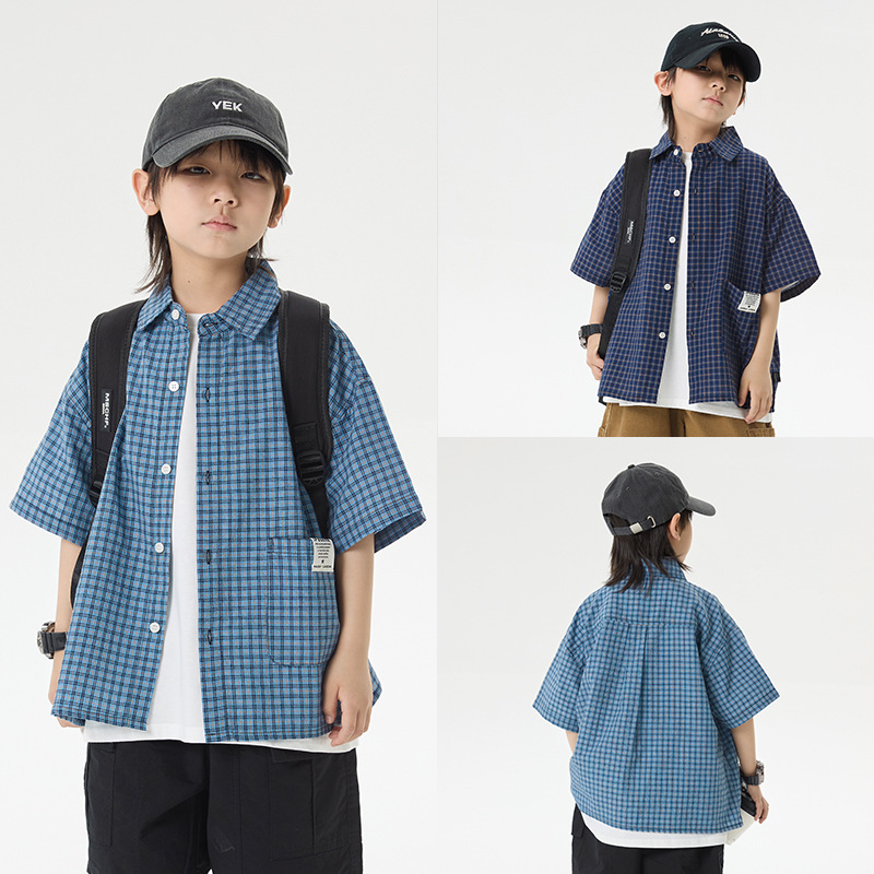 Boys’ Short-sleeved 2024 Summer New Children’s Korean-style Plaid Shirt Loose Handsome Top Trendy Children’s Wear