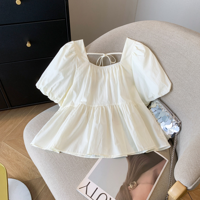 Solid color square collar short sleeve shirt women’s summer college style design doll shirt lace-up waist short jacket wholesale