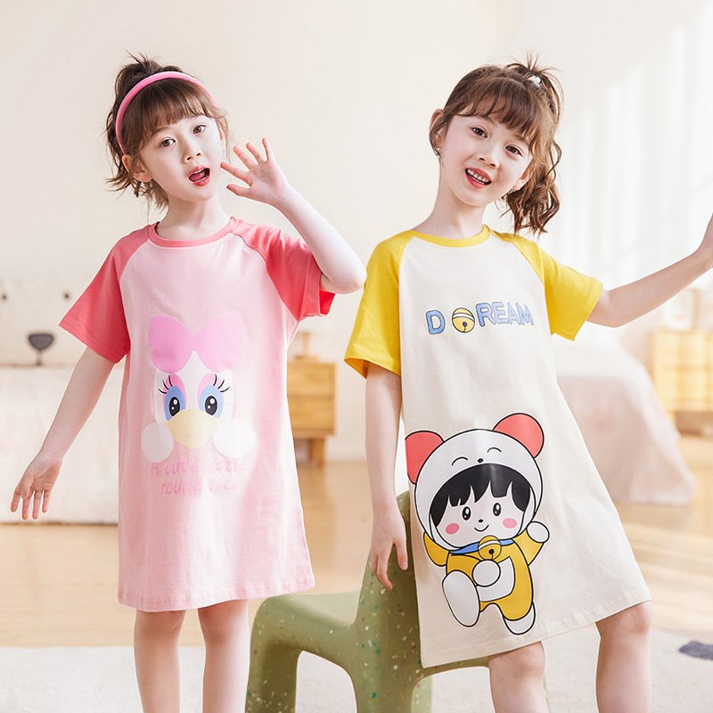 Children’s Nightgown Summer Short-sleeved Pure Cotton Thin Large Children and Girls Cartoon Printed Pajamas Summer Princess Style Hair
