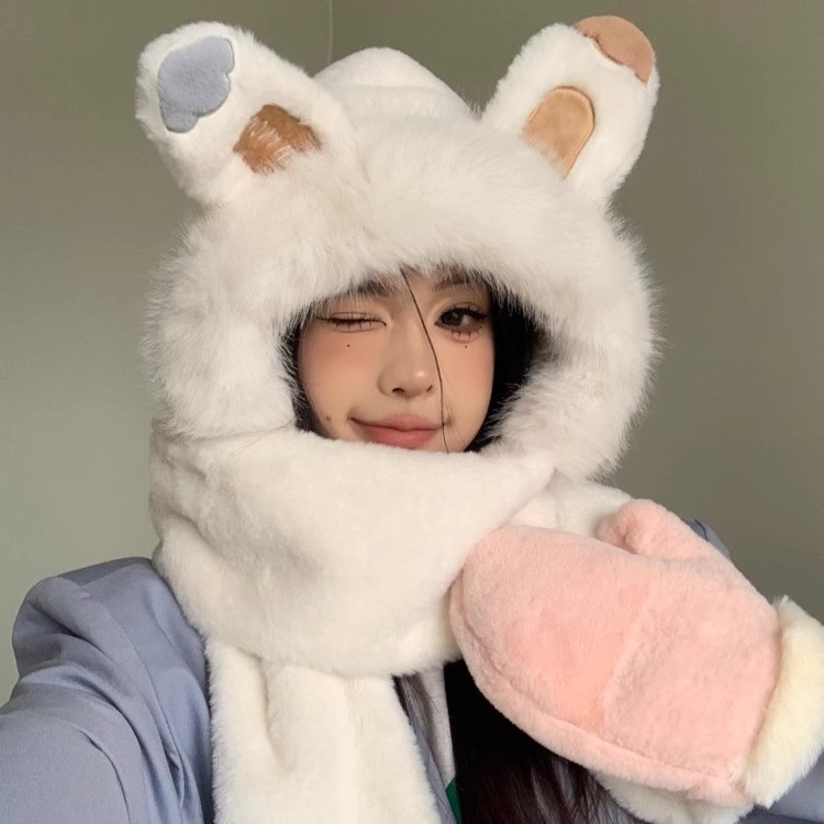 Korean style rabbit ears three-piece plush hat scarf gloves one-piece women’s winter warm three-in-one thickened scarf