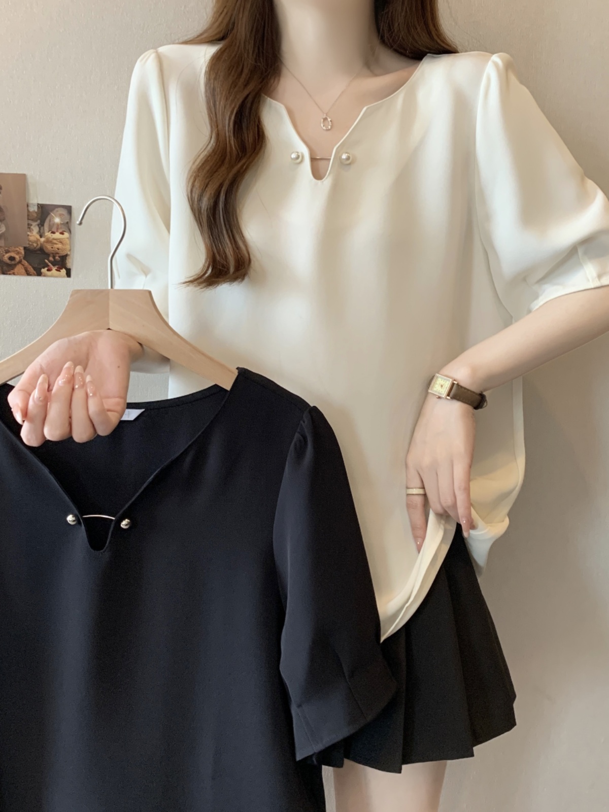 Summer loose slim top front shoulder V-neck short-sleeved T-shirt