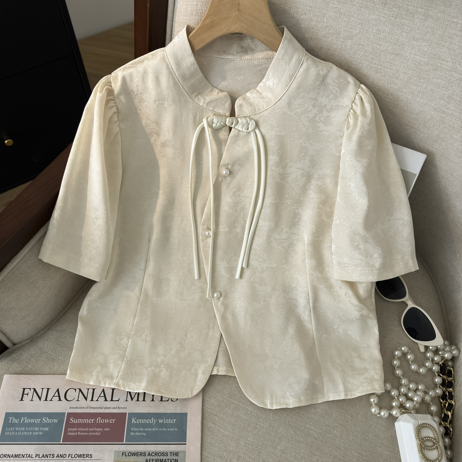 Real shot 2024 new summer high-end sense plate buckle national style short sleeve top new Chinese satin jacquard shirt women