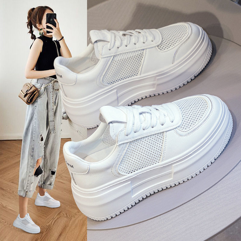 Top Layer Soft Leather Thick Bottom White Shoes Women’s 2024 New Style Platform Bottom Board Shoes Women’s All-match Casual Breathable Mesh Cross-border