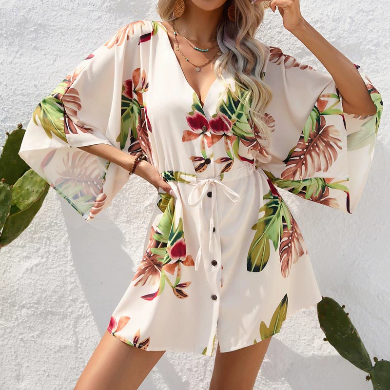 Fashionable floral cool pocket short-sleeved cotton silk dress