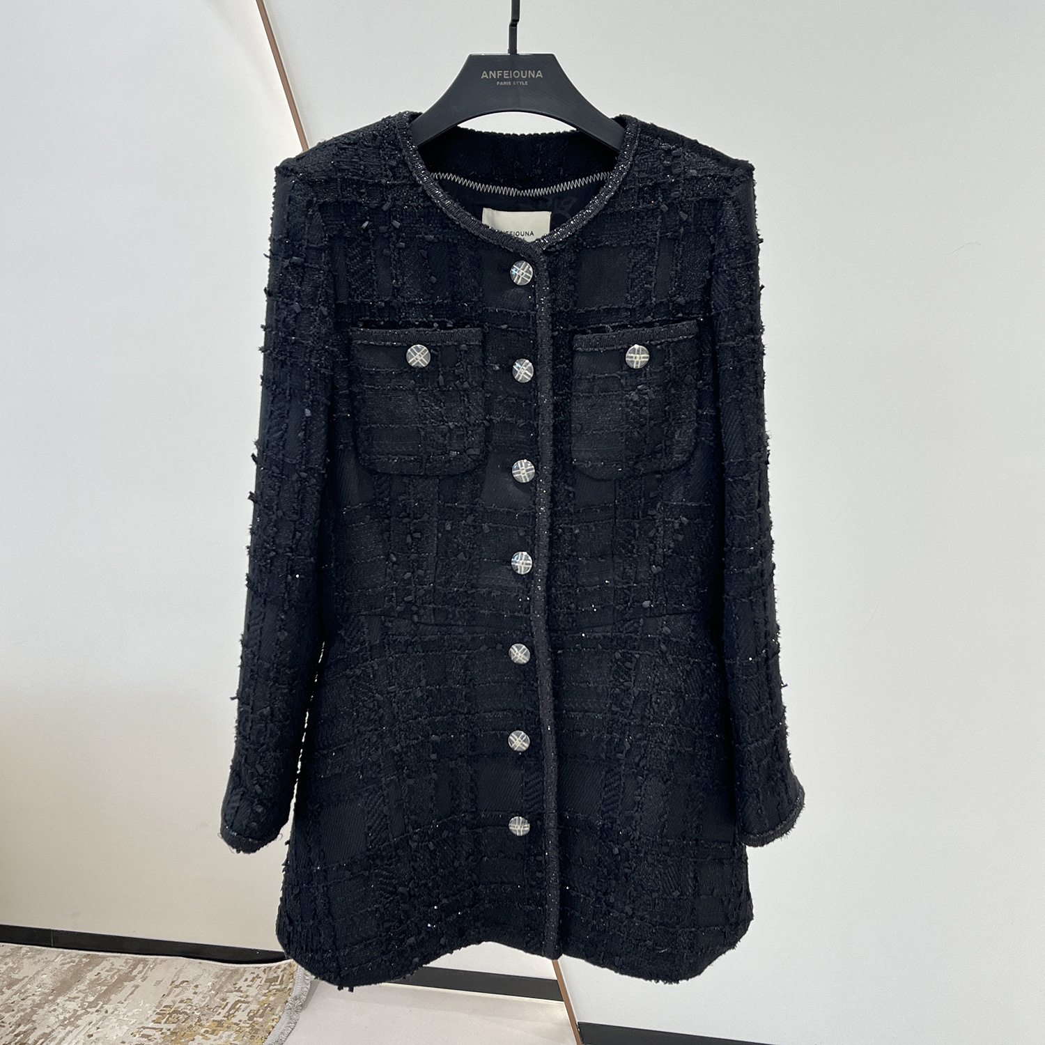 Anfeiona Spring and Autumn New French style Chanel black bright silk tweed mid-length slim-fit slimming coat