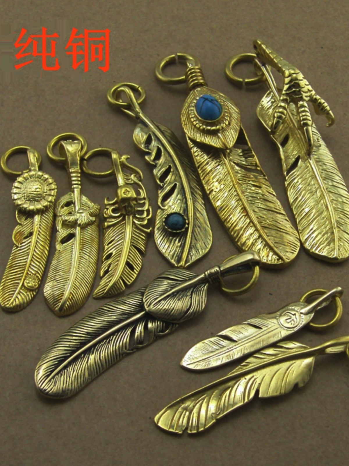 Brass pendant Japanese style Takahashi Goro pure copper feather turquoise necklace pendant handmade car key chain pendant