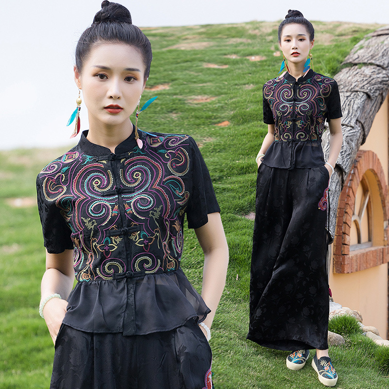 Summer New Ethnic Style Women’s Clothing Jacquard Satin Heavy Embroidered Cardigan Niche Padded Embroidered Short-sleeved Blouse