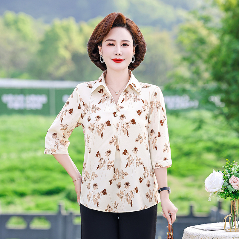 Summer Mother Clothes Printed Shirt New Elegant Seven-point Sleeve Pullover Imitation Ice Silk Fashion Casual Top Women’s Clothing