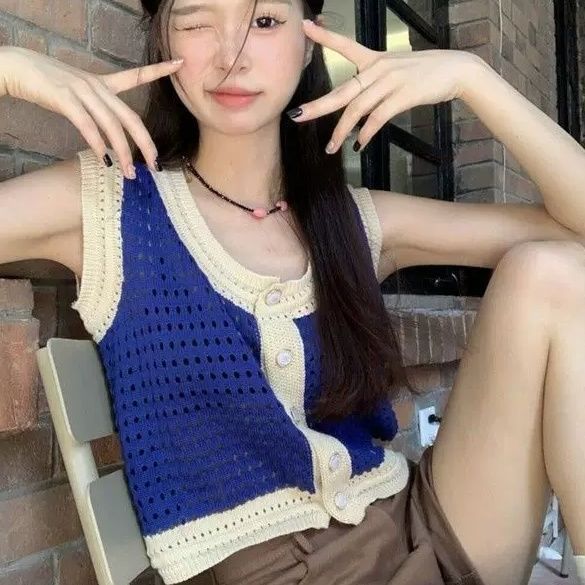 Design Sense Hollow Knitted Sweater Sleeveless Vest Women’s Outer Wear Summer New Style Small Slim-fit Slim-fit Short Top